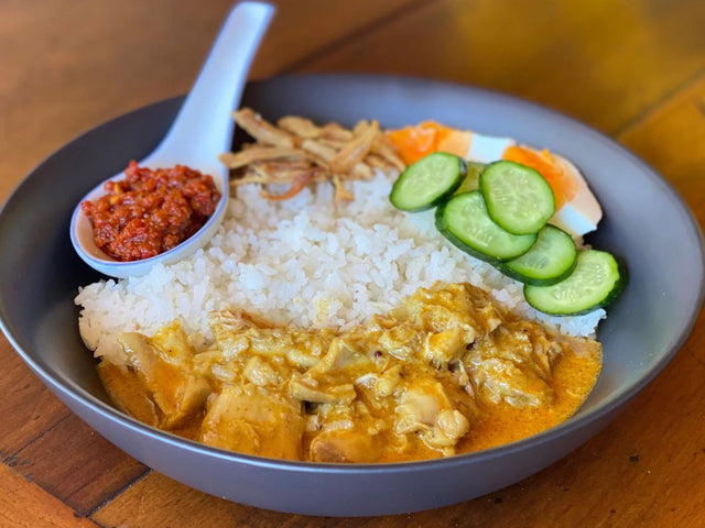 Lean chicken is slowly simmered till tender in in our own authentic Malaysian curry sauce. It's not an overpowering curry - there's just enough heat in the curry to warm the back of your throat. For a quick, easy, tasty dinner at home just add steamed rice. Either yours, or ours if you're in an extra hurry! (If you like, add your own boiled egg, cucumber, ikan bilis and chilli paste on the side to transform this fabulous curry into Nasi Lemak