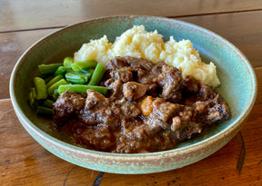 Pasture-fed beef is slowly braised traditionally with red wine (Burgundy) along with the rich flavours of our chef's own home-made beef stock, bacon, onions, mushrooms, tomatoes, carrots and herbs.