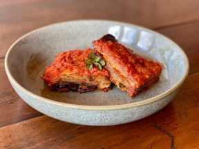 A bit like lasagna without the pasta! Long slices of eggplant are layered with parmesan and mozzarella, and baked in a deep rich tomato sauce, and fresh basil. Slightly smokey and definitely tomatoey, it's a dish that packs a big punch of Italian flavour.